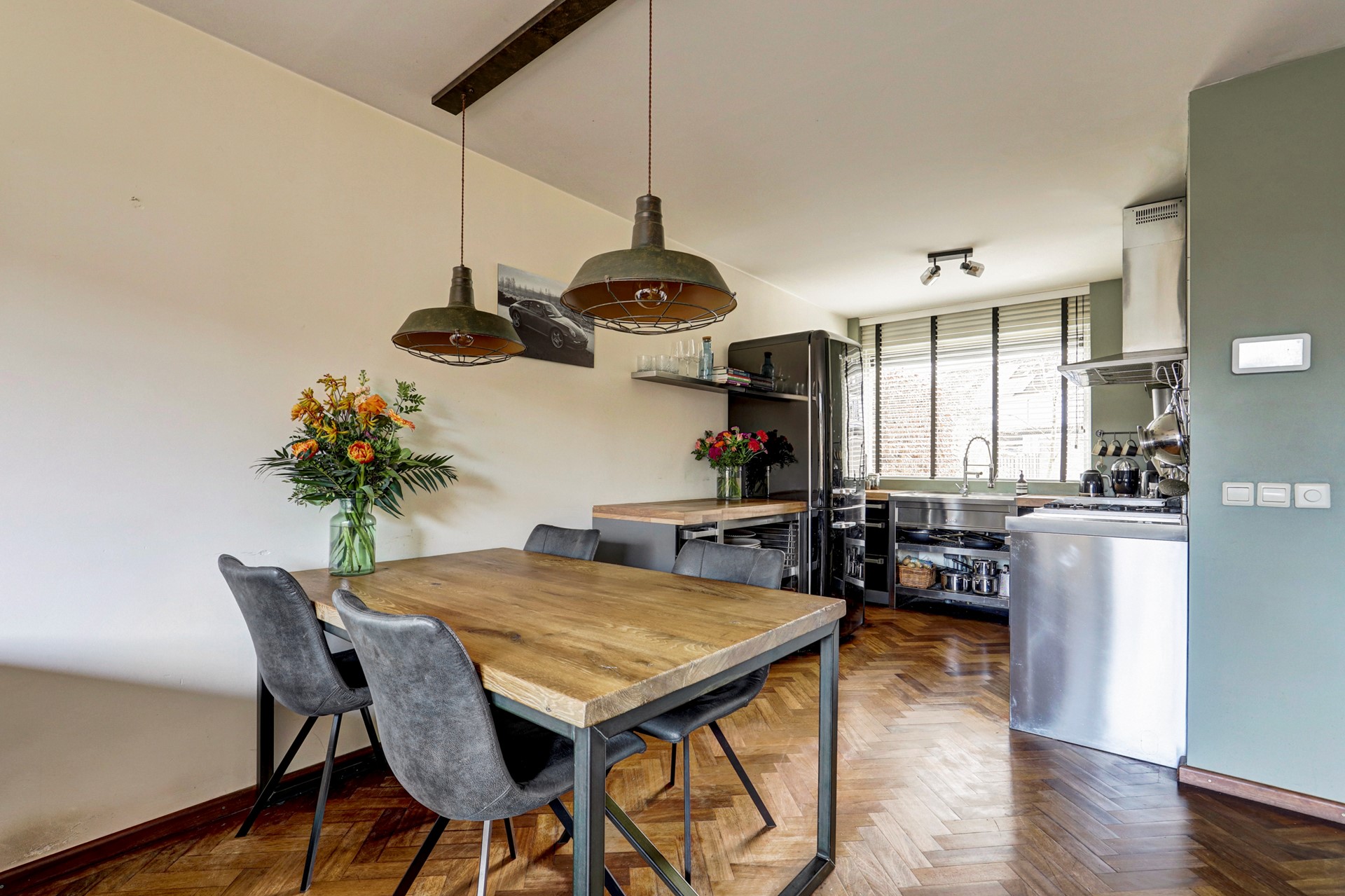 Bij binnenkomst word je verwelkomd door een lichte en ruime woonkamer die via de open keuken direct overloopt in een gezellige leefruimte. Ideaal voor spelende kinderen, lange diners of een avondje borrelen. De hal herbergt het toilet, de trapopgang en de meterkast. De woonkamer is afgewerkt met een visgraat parketvloer, en de keuken combineert een industriële look met moderne inbouw- en losse apparatuur, klaar om jouw culinaire avonturen te ondersteunen.