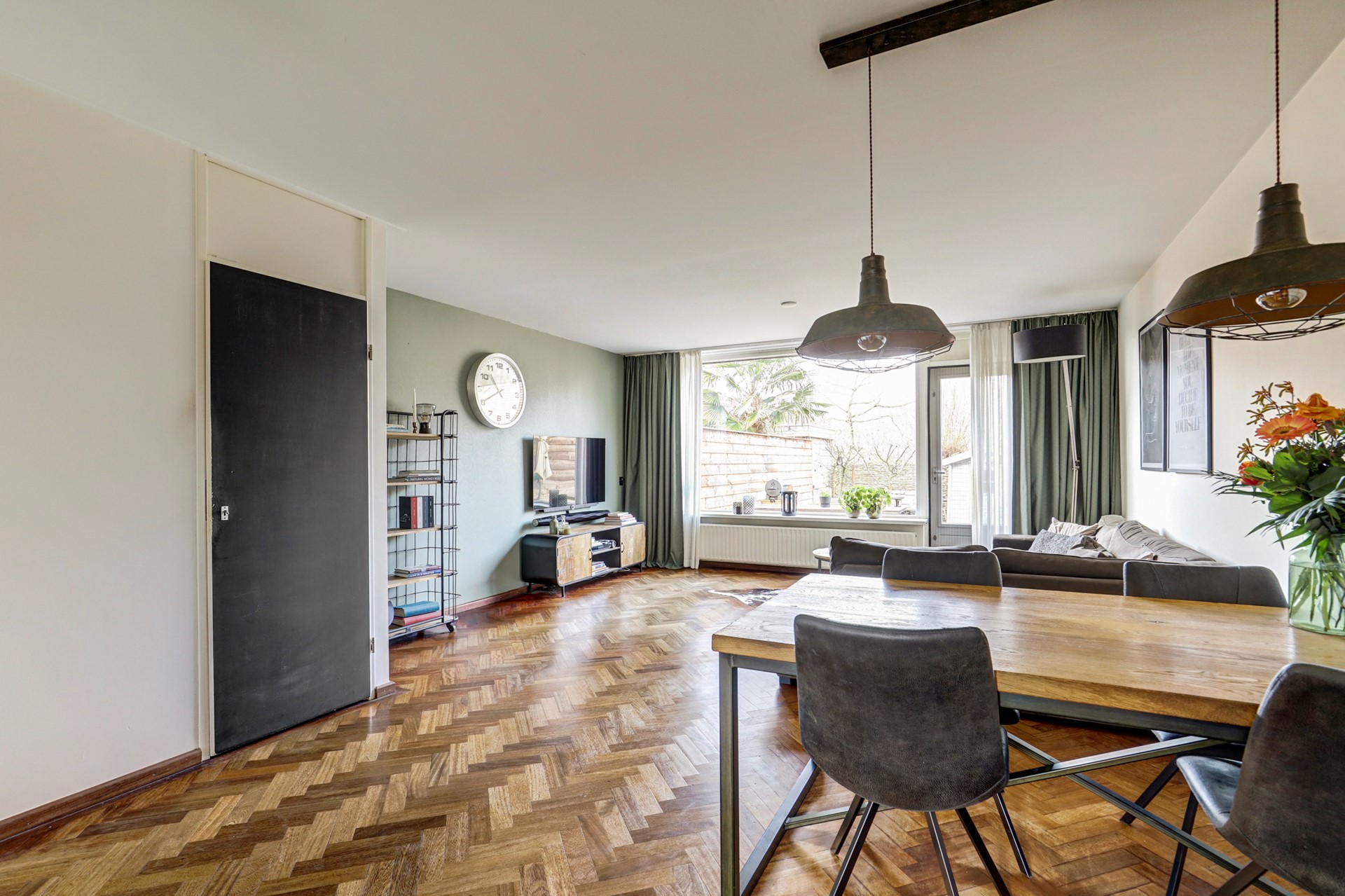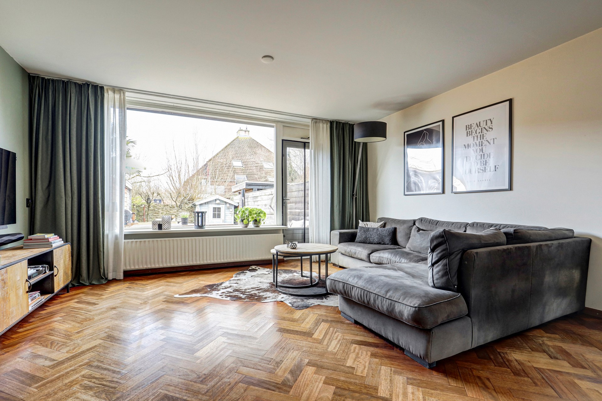 - Gezellige woonkamer: Lichte, ruime leefruimte met visgraat parketvloer en open keuken