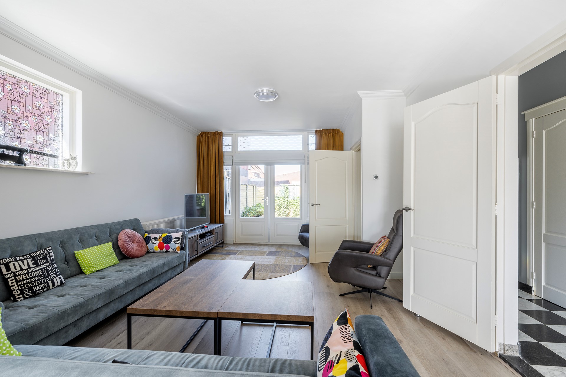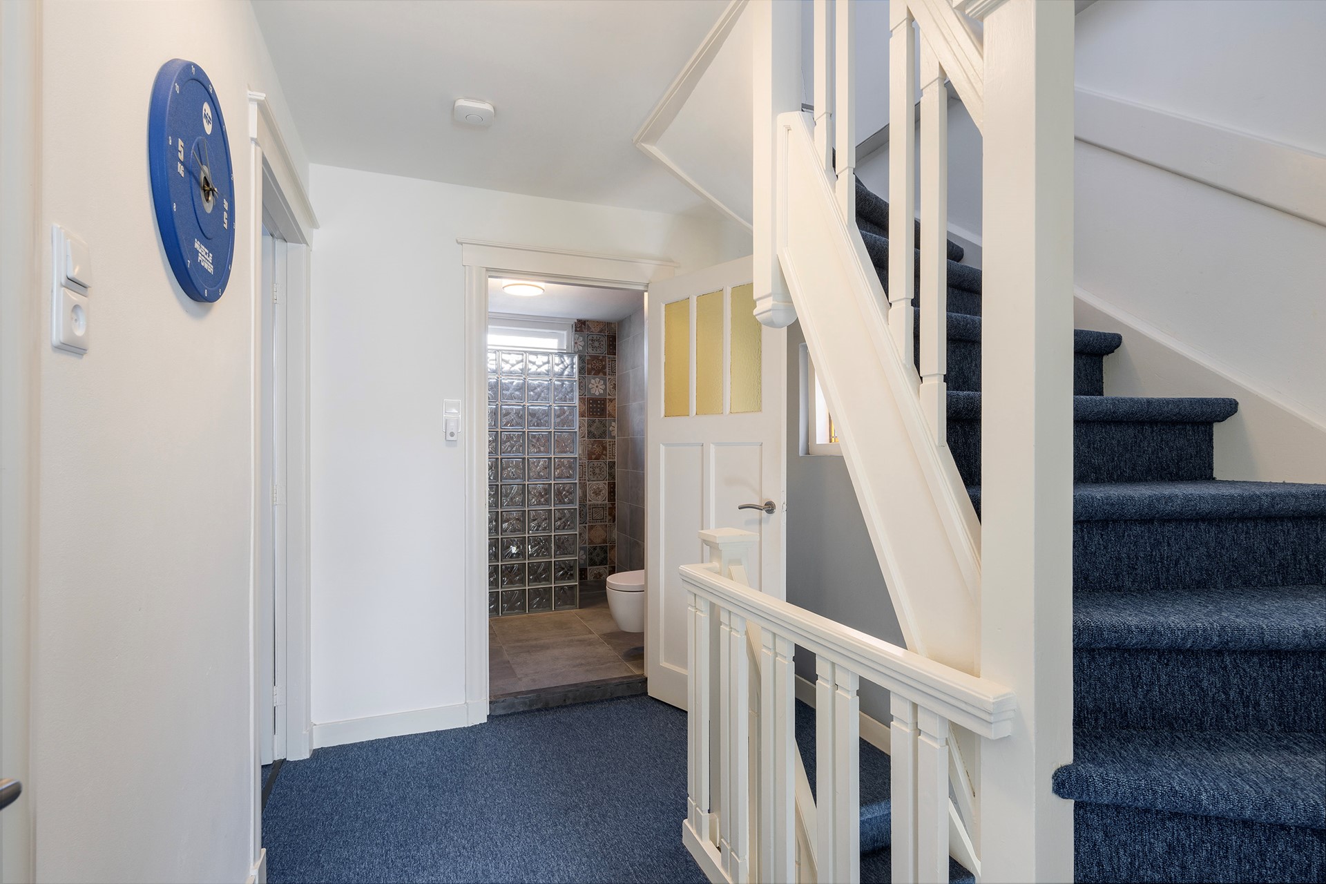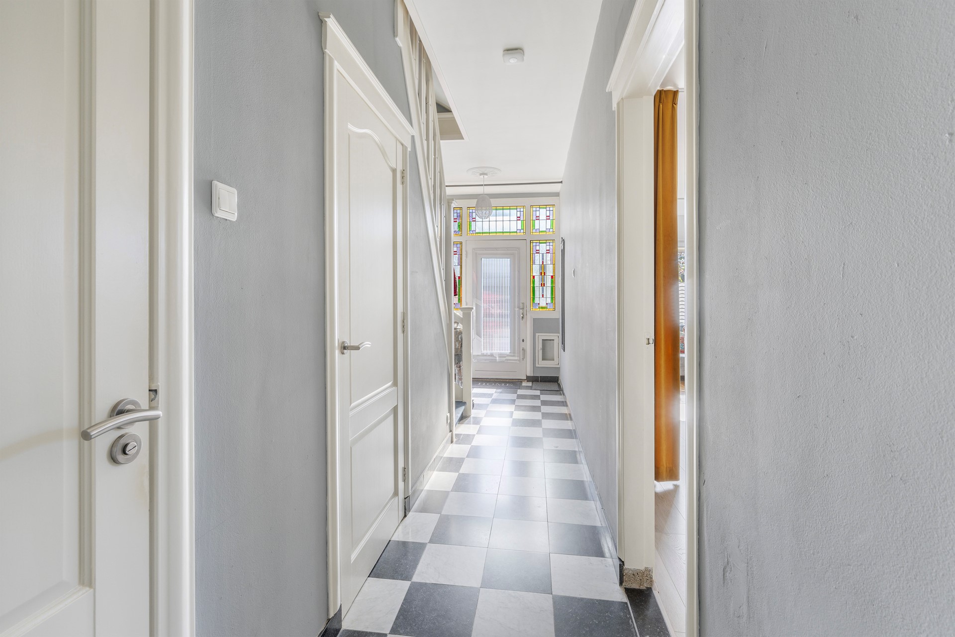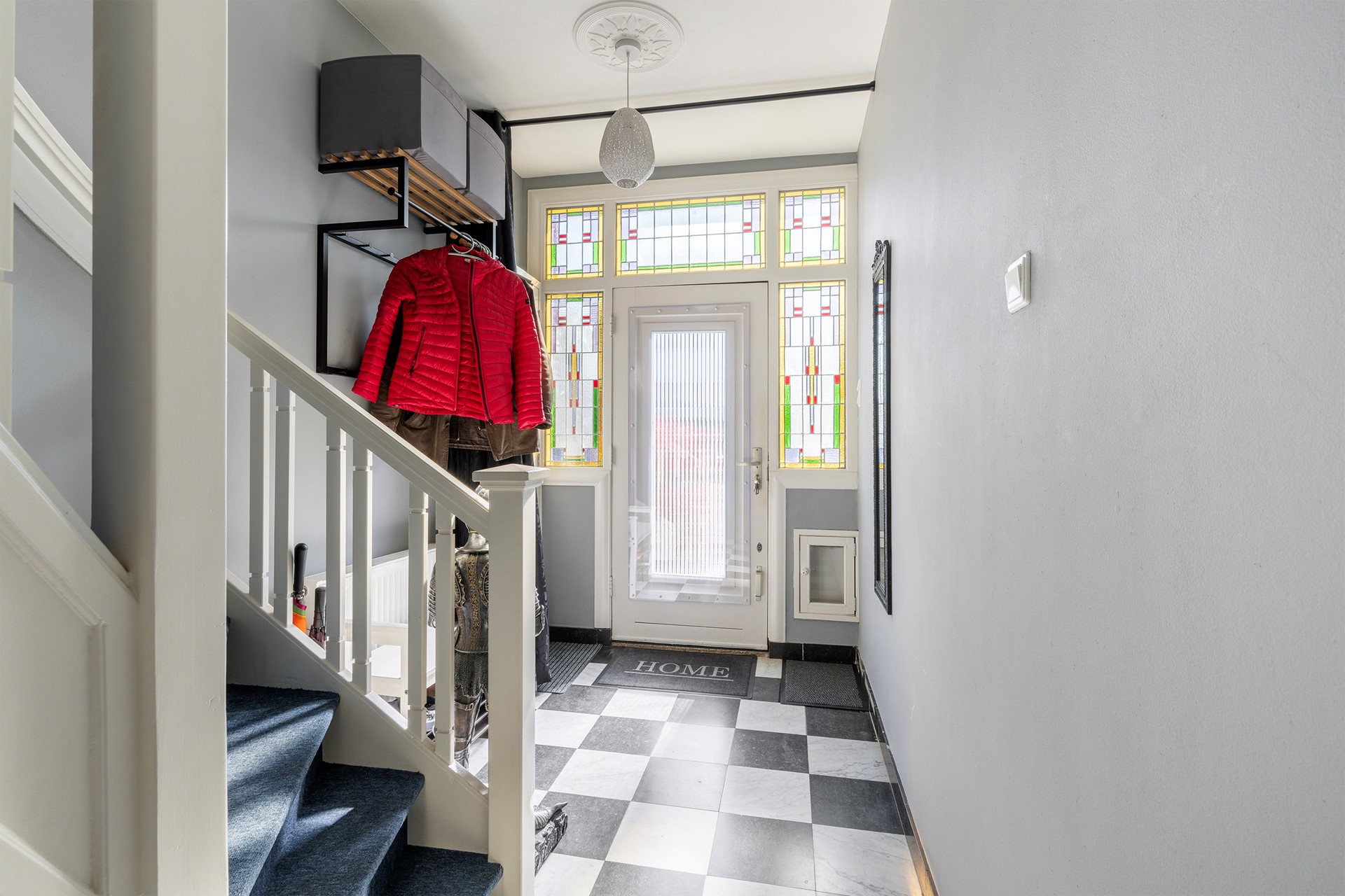 De klassieke entree met glas-in-loodramen maakt meteen indruk. De ruime hal biedt toegang tot de trapopgang, het moderne toilet en een praktische trapkast. De lichte woonkamer met fraaie zichtlijnen en openslaande deuren naar de tuin vormt het hart van het huis: een plek waar sfeer en comfort samenkomen.