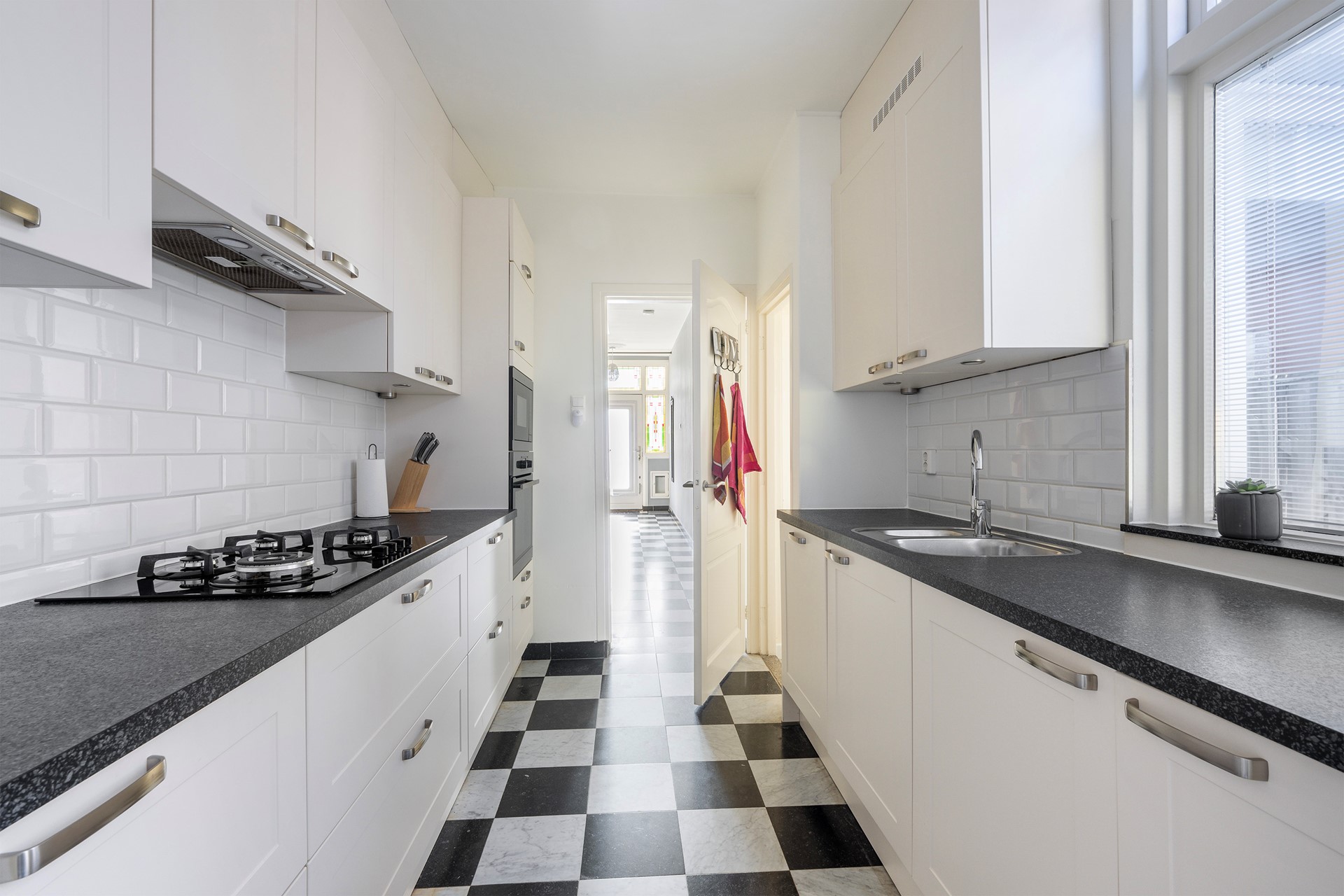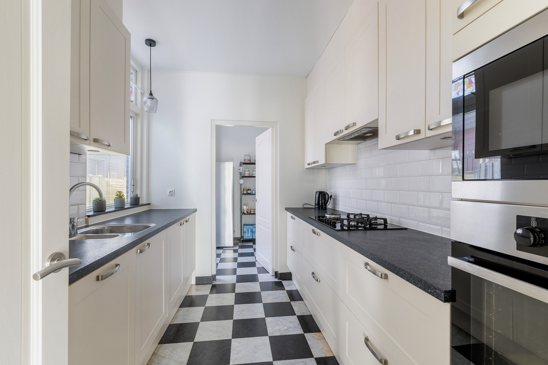 De keuken bevindt zich aan de achterzijde en is voorzien van een dubbele opstelling met moderne inbouwapparatuur. Aangrenzend ligt de bijkeuken met de CV-opstelling en eveneens toegang tot de tuin – handig en efficiënt.